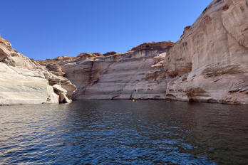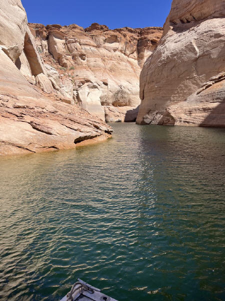 Die lässige einstündige Bootstour führt uns in den überfluteten Antelope Canyon, jener Canyon der später zu einen Slot Canyon wird, den wir uns ja gestern angesehen haben. Wunderschön!